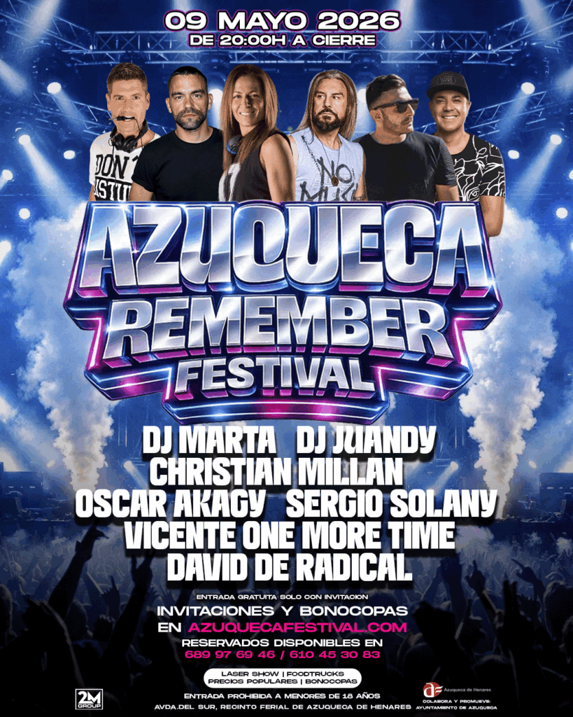 El Azuqueca Remember Festival es mucho más que un evento musical. Es un viaje directo a la época dorada del dance, una noche donde los himnos que marcaron a toda una generación vuelven a sonar con la energía de un gran festival. Nostalgia, emoción y pura música remember en un entorno diseñado para revivir recuerdos.